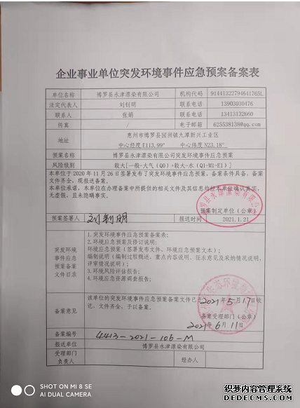 已制訂《博羅縣永津漂染有限公司環(huán)境風(fēng)險評估報告》,并于2017年5月31日上報博羅縣環(huán)境保護(hù)局備案;
