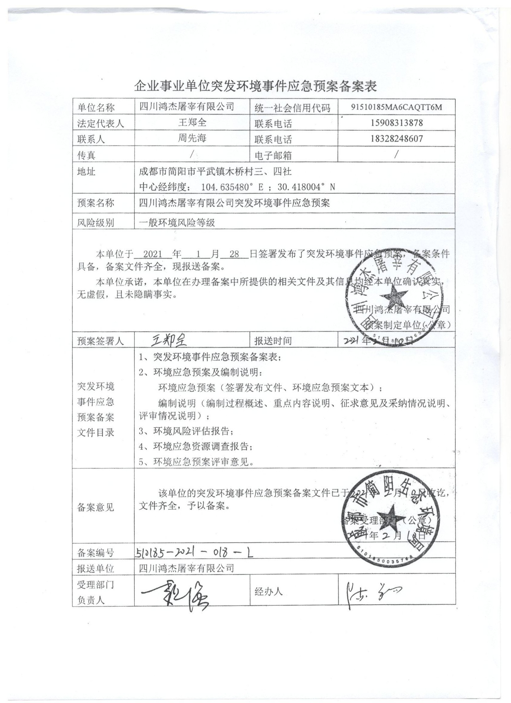 已制訂《四川鴻杰屠宰有限公司突發(fā)環(huán)境事件應(yīng)急預(yù)案》,并于2021年 2月 12日在成都市簡(jiǎn)陽生態(tài)環(huán)境局備案, 備案編號(hào):510185-2021-018-L 附件鏈接: 《四川鴻杰屠宰有限公司突發(fā)環(huán)境事件應(yīng)急預(yù)案》電子版(點(diǎn)擊打開); |